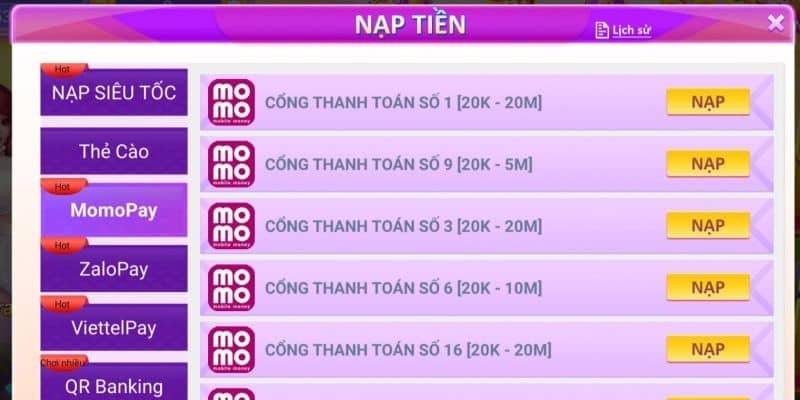 - Bước 2: Trong mục “Nạp tiền,” bạn cần chọn ví điện tử mà bạn muốn sử dụng, chẳng hạn như Momo, ZaloPay, hoặc ViettelPay.